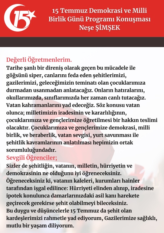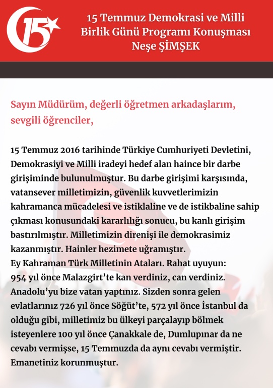 15 Temmuz 2016 gecesinde, milli iradeyi ve demokrasimizi hedef alan hain darbe girişimi, milletimizin kahramanca mücadelesi sonucunda engellenmiş ve demokrasimiz kazanmıştır. Tarihe şanlı bir direniş olarak geçen bu mücadelede göğsünü siper, canlarını feda eden şehitlerimizi anmak, hatırlatmak ve unutturmamak amacıyla “15 Temmuz Demokrasi Zaferi ve Şehitleri Anma” etkinlikleri kapsamında okulumuzda bir program düzenlendi. Programı hazırlayan öğretmenlerimiz Mehtap ÖZ, Nesrin BULUT, Neşe ŞİMŞEK'e ve öğrencilerimize teşekkür ederiz.